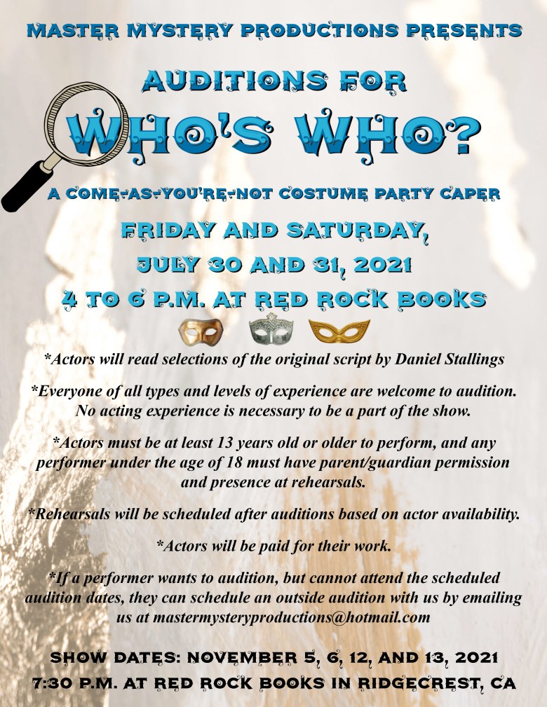 Who’s Who? is a new production that reunites us with our favorite bookstore, Red Rock Books, for a fun, wacky, and wild mystery. Inspired by caper and heist stories like The Great Muppet Caper, It’s a Mad, Mad, Mad, Mad World, Rat Race with a smattering of The Westing Game thrown in for good measure, the story revolves around a bungling and ragtag group of strangers who are attempting a rather ludicrous heist of their own. Except they have no idea what they are trying take in the first place! There’s no strong language or violence; We wanted to focus on humor and hijinks for our mystery this time. We are styling the entire show as a classic costume party where guests can attend in any costume they wish while our band of actors tries to negotiate nefarious deeds dressed as pirates, royalty, flappers, and more. Our script has seven roles to fill with many of the parts gender neutral, so they can be played by anyone!