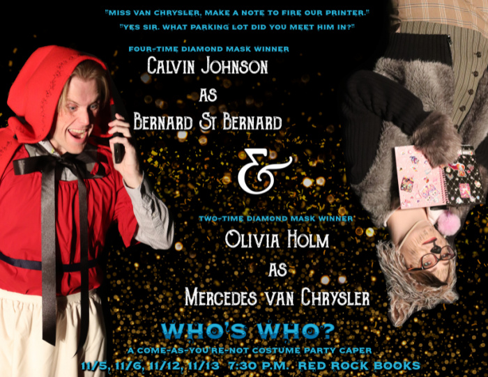 “I was drawn to Who Who’s because it is a comedy full of wit and physical humor, including the character of Georgina. I look forward to playing the physical side as I haven’t gotten to do a lot of that but I’ve always enjoyed watching it onstage. Something else that’s fun is the characters have their costume party persona and who they really are behind it that gets revealed along the way. It’s been fun to build up who Georgina is in either instance and her backstory. She loves to go to fancy functions, which Georgia is good at getting them into, even ones they aren’t invited to. She enjoys vacationing in Paris and money, jewels, and glitter are things she can’t live without. She reads a lot of novels and her two favorite authors are Michael Crichton and Jane Austen. She likes to watch heist and crime movies. She started three different degrees but never finished any of them. She is divorced from a marriage that she got into really young but has no children. She listens to gossip but only repeats what’s true, of course. One of her pet peeves is seeing rich people waste their money when there’s such better places it could go. Like her, for instance.”