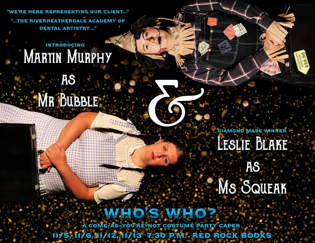 Messrs. Bubble and Squeak are two seemingly stodgy, stiff-upper-lip British solicitors with the uncanny habit of completing each other’s sentences who seemingly represent the dentistry school Aunt Honeypot is leaving her money to. But something isn’t quite tea-and-crumpets about this strange duo. Maybe it’s the fact they don’t know what a solicitor does. Martin joins us for his first Master Mystery Production as Mr. Bubble in Who’s Who?, but has been seen onstage in the past as Don Issachar in Candide, Thing 2 in Seussical, Tom Snout in A Midsummer Night’s Dream, and an Oompa Loompa in Willy Wonka. He has been a judge for the Drama Teachers Association of Southern California’s acting festival and has worked as crew on several short films. Martin shares his view on what makes Mr. Bubble pop onstage: