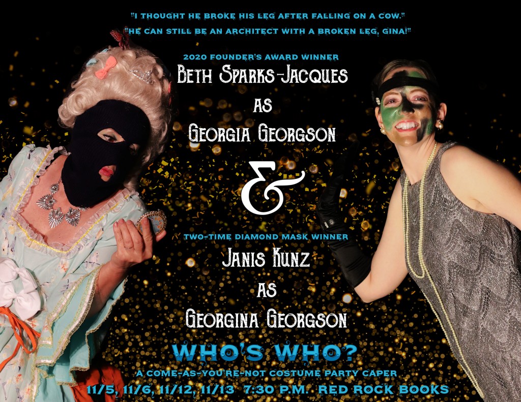 Janis Kunz, playing Georgina Georgson, is a multiple award-winning Master Mystery Productions’ Hall of Fame Artist who has won the Skeleton Key Award for Service Above and Beyond for Eat Cake, two Diamond Masks for Polly the Parrot in Mutiny on the Sea Witch and Captain Wallis in Close Encounters of the Hairy Kind, and the Founder’s Award from MMP for 2019. She also stars as Emma Emerson, the lead in Regions Beyond, MMP’s paranormal found footage radio mysteries on YouTube. Additional accolades include the Blood, Sweat, and Tears Award from Ridgecrest Community Theatre Troupe for Mutiny on the Sea Witch. Janis gives us her interpretation on the less…melodramatic Georgina: