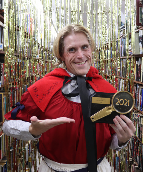 But no show can last forever, and closing night is our traditional awards night. And we had a LOT to celebrate in this show as the first live show in almost two years, the end-of-season show, and the first chance to celebrate with an audience the achievements of MMP members that may have gone silent. First up was The Skeleton Key Award for Service Above and Beyond, our oldest award. Each designed to uniquely reflect the show it was made for, the Skeleton Key Award is a symbol of an individual putting their heart and soul into a Master Mystery Production, going above and beyond their assigned jobs in the show to make it the best it can be. They are inspirations to us in the company, and they remain celebrated in our programs and on our website for years to come. Our winner for this production has been an extremely hands-on new member of our company who has helped out in every conceivable facet of the show. Congratulations to Martin Murphy on winning the Skeleton Key Award for Who’s Who?!