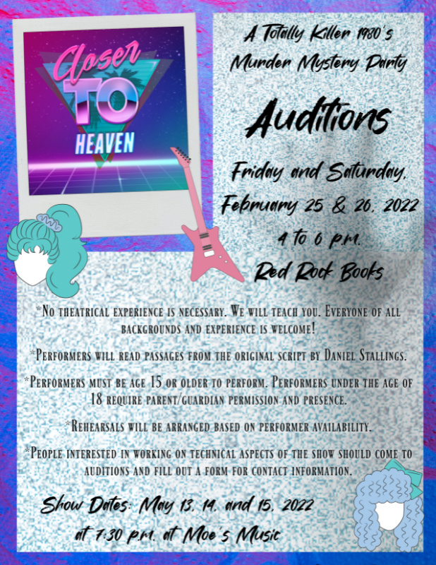 Closer to Heaven will combine all the things we love about a Master Mystery Production–interactive storylines, kooky characters, and amazing technical work from lights to costumes to hair to makeup–with a brand new decade to explore and a new venue to play in. What more could we want? Maybe actors and crew members to help us bring this awesome show to life. Join us at auditions and let the fun begin!