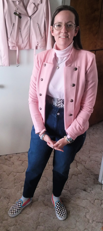 When it came to Stella, the character brief heavily informed her look: “A sprinkle of preppy and Princess Diana fashion sense keeps this fish firmly out of the water.” A powder-pink turtleneck, high-waisted dark blue denim, and a pastel pink almost-suit-jacket speaks to her inexperience with the L.A. fashion scene. We added in a zebra-print belt and rainbow-checkered Vans to allude to her desire to branch out from her timid Montana upbringing. Stella has two costume changes within the show. In one she gets a denim vest, reminiscent of How I Met Your Mother’s mallrat popstar Robin Sparkles (another creative contribution, this time from set dresser Heather McGaha). We adorned the vest with vintage 80s pins, such as one for the 1984 L.A. Olympics, and with pins crafted into commemorative pins of albums from the 80s just for the costume. The vest gives a visual 80s pop, but it also helps tell the unspoken story of Stella’s makeover by the Angels. The other costume change is a jacket she wears in the end and it tells something of where her character is now at. And it does this by being drastically different in cut, style, and attitude of the jacket she wore in the beginning.