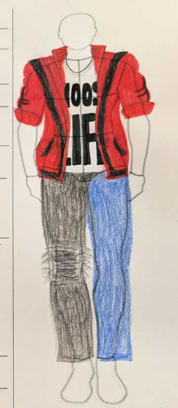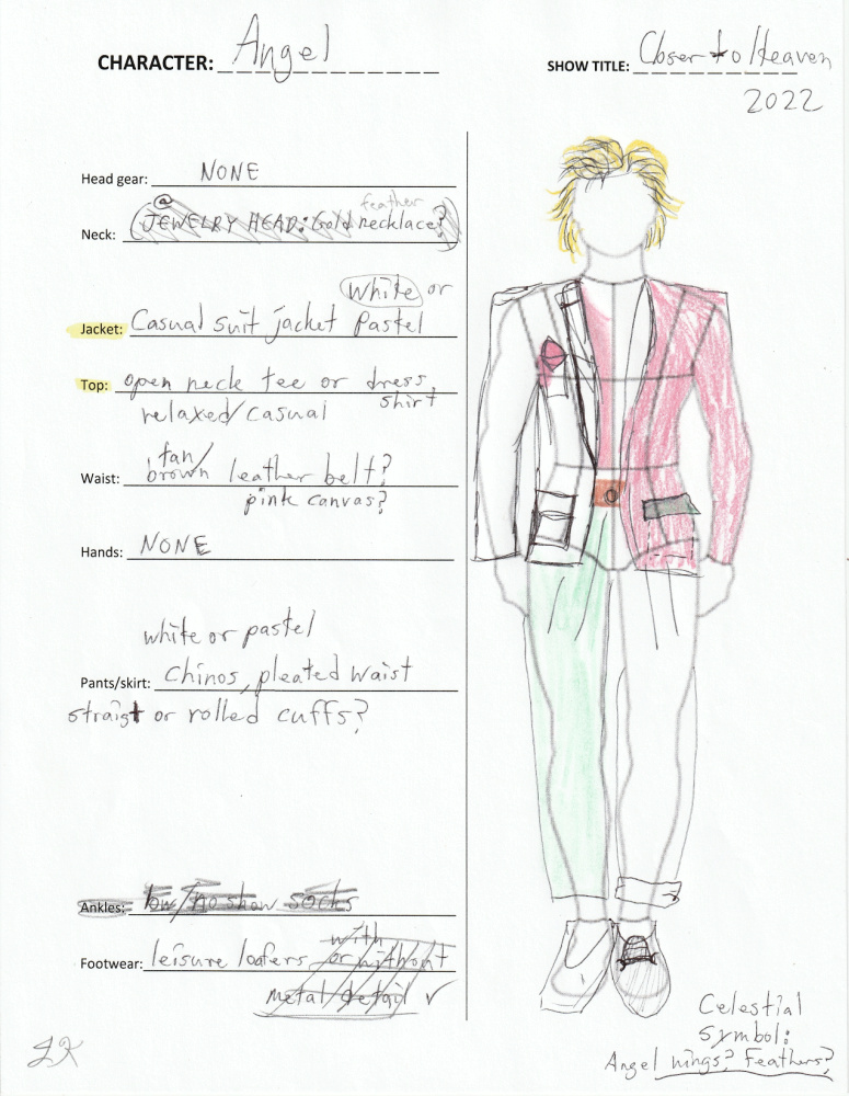 As Dutch philosopher Eramus said, “vestis virum facit” (“the clothes make the man”), and in theatre the costumes shape the character and how the audience feels toward them. For Closer to Heaven’s costumes that meant taking bits of each character and their story and incorporating it into their costume to enhance or showcase aspects about their personality, their journey, and their connection to other characters. Additionally, the costumes needed to mesh cohesively as a unit, that is, share motifs (like tears and slashes, heavenly/celestial symbols, etc.) and strong 80s vibes, while also having different textures, patterns, colors, and silhouettes in order for each one to be its own entity within the group.