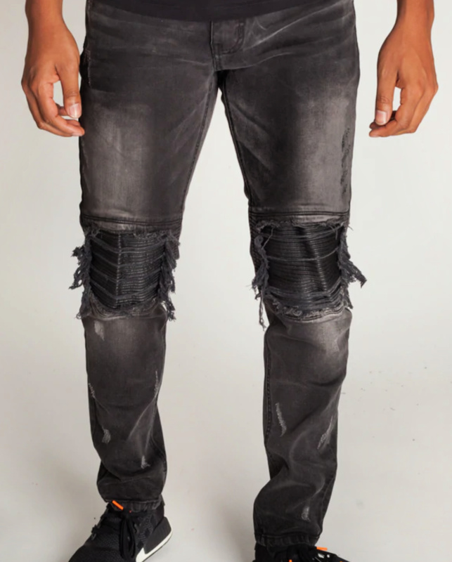 Next we needed other pieces that would fit with the stylish coolness of the jacket and ones that would tell more of his story. An internet search for inspiration later and we found what we needed. He would wear one-of-a-kind distressed jeans that looked like SFX themselves with red-veined pleather handsewn inside and showing through the gashes in the denim, which caused a skinless flesh meets veins and arteries effect.