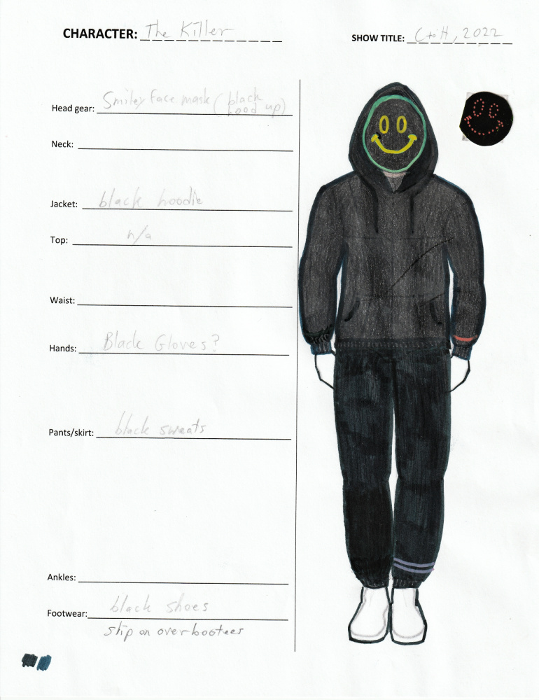 For the costume of The Killer we wanted something that was creepy as all get out but with a new wave flavor to it. Enter an all-black hoodie and sweats, broken by just a stripe or two of rave-worthy neon, and a grinning, neon-colored full-face mask with dead, staring eyes. Possibly the most challenging for technical reasons in the show such as needing to be able to go on and off quickly over other outfits, this costume also had to have a mask that would still allow for safe movement by the actors. A plastic mask with see-through mesh over the eyeholes achieved the effect of a scary nonface of a masked villain while also providing for safety. Several chilling inspirations can be seen in this costume, like Michael Myers, the Unabomber, Ghostface… We just put a new wave spin on it!