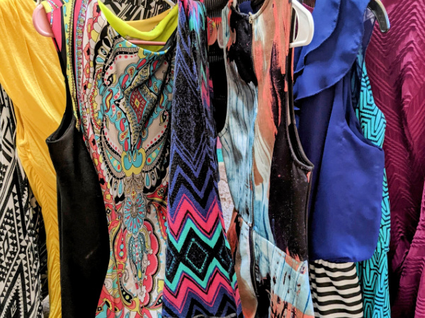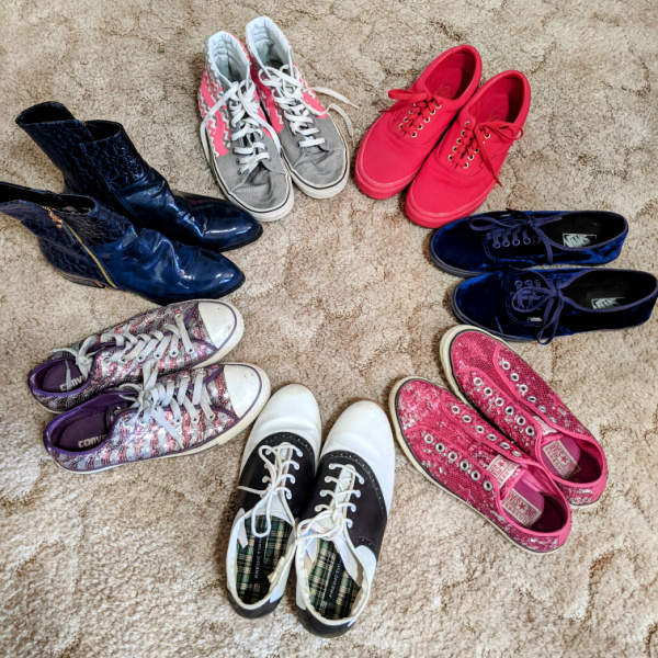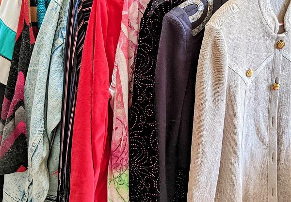 I like to collect costume pieces and cool jackets and because I knew this project was coming up, I began to informally amass pieces that might work for an 80’s show. As it turned out, I wound up having so many costume pieces that would look good that we came up with the idea to include ones that didn’t work for the characters elsewhere in the show. The set designer and set dresser both liked the idea and now the 80’s clothes get to extend to the costume rack in the ‘dressing room’ part of the stage as set dressing and props and also be hung on the venue’s black-painted backdrop wall as fashionable art! There are also some story-driven moments that allowed for costume changes so having alternate choices was nice.