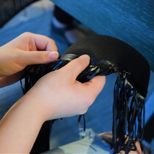 The character of Crystal is another example of needing to show two sides of her character. She is both the horror movie fanatic and the valley girl in equal measure. The actress sourced much of the costume herself. The base of her costume is a Freddie Krueger sweater dress and then we bedecked it with, like, TOTAL color, you know, to make it just POP! Neon yellow leggings, hot pink legwarmers, pink jelly shoes, neon pink fingerless gloves, and a wide yellow belt electrify the muted red and green of the Freddie dress. Finally, hockey mask earrings a la Jason Voorhees in the Friday the 13th franchise add another pop of slasher horror. Her costume says she knows what she likes and she’s not afraid to show it! The two juxtaposing elements of her personality shine brightly from this combined costume and create a unique whole that isn’t like your average characters on stage.