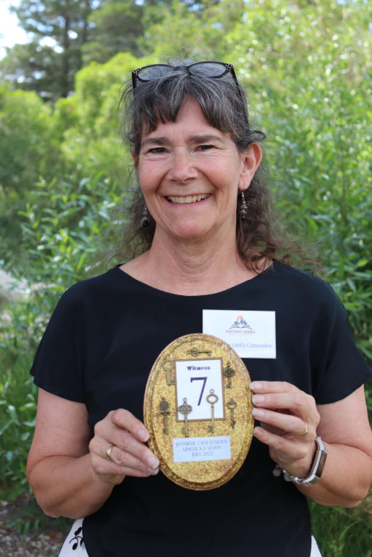When a show closes, we love to honor the people who have helped us bring these shows to life and those whose excellence in their craft deserve to be recognized. And so, we present our company awards at curtain call. First up was The Skeleton Key Award for Service Above and Beyond, our oldest award. Each designed to uniquely reflect the show it was made for, the Skeleton Key Award is a symbol of an individual putting their heart and soul into a Master Mystery Production, going above and beyond their assigned jobs in the show to make it the best it can be. They are inspirations to us in the company, and they remain celebrated in our programs and on our website for years to come. The winner here was a chief organizer of the Eastern Sierra Book Festival and owner of Whistling Rabbit Press who worked so hard to ensure our comfort and our place in Mammoth at the Festival, sharing all out publicity, and consistently celebrating our work and the work of all the vendors. An absolute treasure! Congratulations Jennifer Crittenden for winning the Skeleton Key Award for Unlucky Seven!