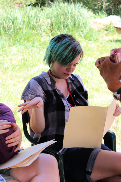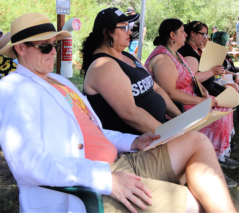 The characters were hilarious, outlandish, and suspicious all in delicious measure, and we, as a company, had a ball pushing out vets with characterizations they hadn’t done before. Guests routinely told us how much fun it was. We got to while the away the hours together as a company, enjoying the natural scenery and each other’s company while bringing our 30th production to a new audience and new venue. Thank you Eastern Sierra Book Festival for hosting us!