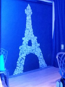 And the piece de resistance of our Surrealist set is the collage of the Eiffel Tower created by cast members Cat Kreidt, Valerie Kramer, Leslie Blake, Janis Kunz, and Olivia Holm. Using photocopies of a real Parisian newspaper from the 1920’s sourced by our prop master, Ed Kramer, we designed an homage to lead character Yves Dufort’s photomontages–another term for collages–by tearing the newspapers into pieces and assembling a mosaic of paper into Paris’ iconic tower. Our amazing cast members were exacting in replicating the details, even down to using photographs and drawings of faces from the vintage newspaper to fill the observation desks of the Eiffel Tower. Assistant Director Olivia Holm even imagined the final touch of having Calvin Johnson–the actor who plays Yves–sign the tower as Yves as if this collage and vision of Paris was a creation of Yves himself, further adding to the sense of imagination and Surrealism in the play. A perfect Easter egg for eagle-eyed guests.