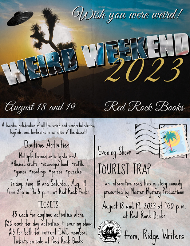 Tourist Trap, an interactive road trip mystery, performs August 18 and 19, 2023 at 7:30 p.m. at Red Rock Books (206 W. Ridgecrest Blvd.). Tickets are $20 general admission and $15 for current members of the California Writers Club. Tickets are on sale right now at Red Rock Books. If you purchase a seat for the show, that also counts as your admission into the Weird Weekend daytime activities from 2 p.m. to 5 p.m. for the date you are going to see the show. Doors open at 7 p.m.
