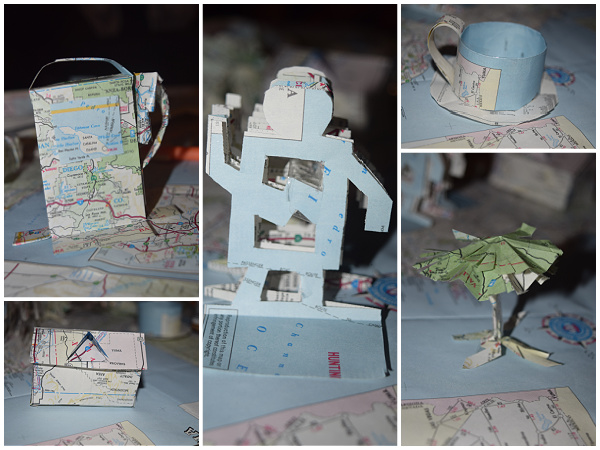 What’s a road trip without a map? And what’s a road trip without arguing over directions? It’s not really possible to jam an entire road trip into a bookstore, but we wanted some means of communicating the scale and scope of the trip in someway. And the simplest way was with a map. But we can get a little extra around here at MMP. Writer/director Daniel Stallings dreamed up the idea of a kind of miniature set, a hybrid dollhouse, play world, pop-up book, and animated itinerary. A map world made from old maps. A symbolic representation of the Morgenstern Family Vacation (as chaotic as any undertaken by the fabled Griswold family) that both they and the audience can interpret for clues.