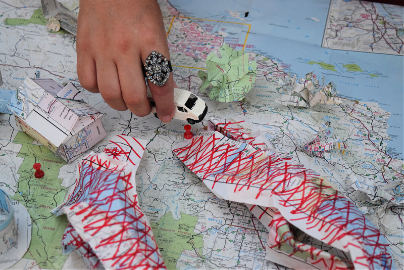 Icons aren’t the only feature on the map. Red Rock Canyon was created topographically by Janis. Then Daniel and Madeleine Smith used a red marker to symbolize the color of the canyon. Red pushpins mark special locations in the script–You Are Here, destinations, and…incidents. Then Daniel designed a system to create little creosote bushes out of the maps to provide more 3-dimensional geography. Nicole Johnson and Madeleine Smith were responsible for the bulk of the creosote bushes. The model van was provided by Michael Stallings, and the character Karen uses it as the stand-in for her family’s van as she recreates their hectic road trip.