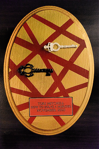 Closing night is our traditional awards night. First up was The Skeleton Key Award for Service Above and Beyond, our company’s oldest award. Each plaque is designed to uniquely reflect the show it was made for, making the Skeleton Key Award a symbol of an individual putting their unique heart and soul into a Master Mystery Production, going above and beyond their assigned jobs in the show to make it the best it can be. They are inspirations to us in the company, and they remain celebrated in our programs and on our website for years to come. Congratulations Tori Mitchell for winning the Skeleton Key Award for How to Solve a Murder!