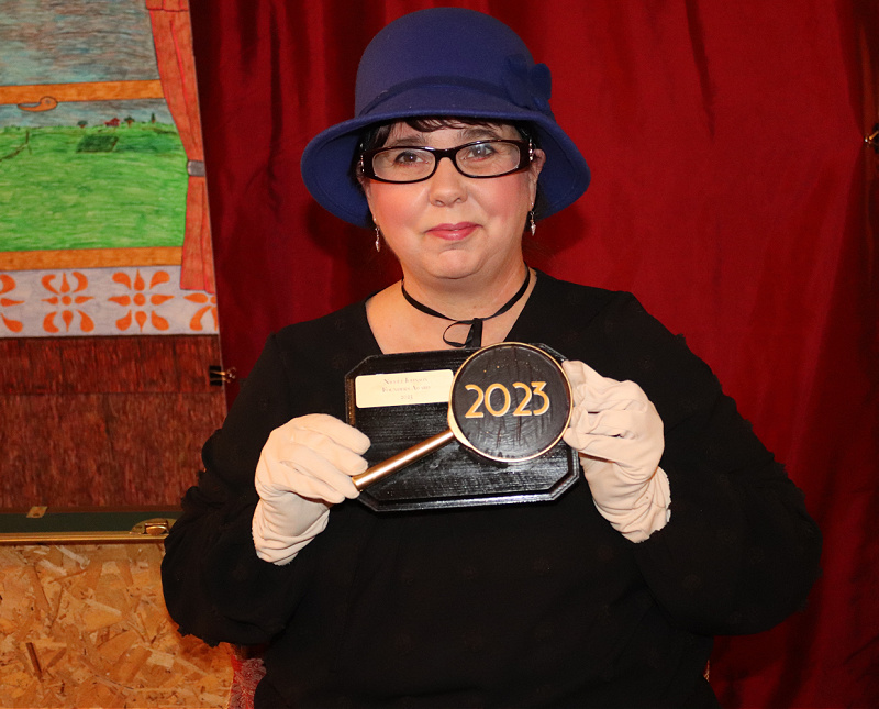 Nicole Johnson worked on all three productions this year–The Sky’s the Limit, Tourist Trap, and How to Solve a Murder. Both onstage and backstage, she has lent her voice and her skills to the company and our shows. She served as Stage Crew and Costume Crew for The Sky’s the Limit, working both in Bakersfield at Hodel’s and in Ridgecrest at Moe’s Music on the performances. She worked with her director and costume designers on sewing costumes for the show in the midst of a hailstorm. She returned to act in Tourist Trap as kooky Della Reeves, a hilarious portrayal that earned her her fifth Diamond Mask Award for Excellence in Performance. Her work extended beyond acting for the show as she assisted in the creation of the 3D pop-up map used in the show, making dozens of little creosote bushes out of cut strips of maps. She learned additional makeup skills and worked on her hair design for the show. On How to Solve a Murder, she became an eleventh hour superhero. Originally stage crew, Nicole took up the mantle of major character Lillianne Highmore when the original performer was unable to complete the production about a month out from opening night. She learned her script after only 9 rehearsals, created her costume, hair, and makeup design in 3 days, and was valuable in keeping the show alive at a critical stage. After all, the show must go on, and she took to the show like a duck to water. She served as prompter for off book rehearsals alongside Tori Mitchell and worked as a set dresser and stage crew. She would help set up the set for rehearsals and performances, assisted in packing and unpacking at the VFW and loading and unloading off-site. She created extra ballots for the closing night performance when we were short. She worked extra hours and longer nights to help mount the productions. For her immense help in keeping How to Solve a Murder afloat, Nicole was awarded a Special Commendation from Master Mystery Productions. And all year long, she shared and promoted the MMP season. Nicole was present, showed initiative, was willing to work when she was needed, and allowed us to end the season strong. For her work across the year, we awarded Nicole the Founder’s Award for a Year of Outstanding Service for 2023. Congratulations Nicole!