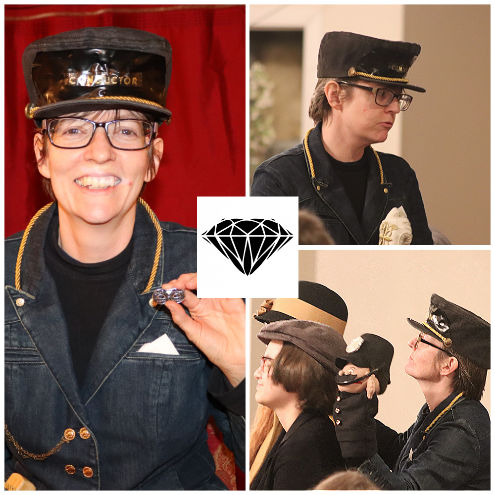 Following the Skeleton Key, we presented the coveted Diamond Mask Awards for Excellence in Performance. Voted by audiences, guests select their nominees for the award based on the performances they liked best. The actors with the most votes win. On their first win, they receive a special diamond pin and subsequent wins will receive a diamond chain to create a cascade of diamonds. Four people won the award for How to Solve a Murder, and they were the first actors to have their awards announced by a puppet: the Chief Constable! Congratulations to Devanne Fredette, Janis Kunz, Daniel Stallings, and Murolo Patchin for your Diamond Mask-winning performances!