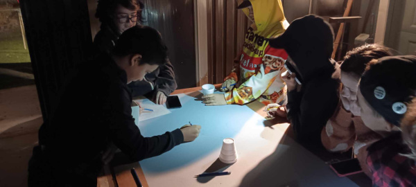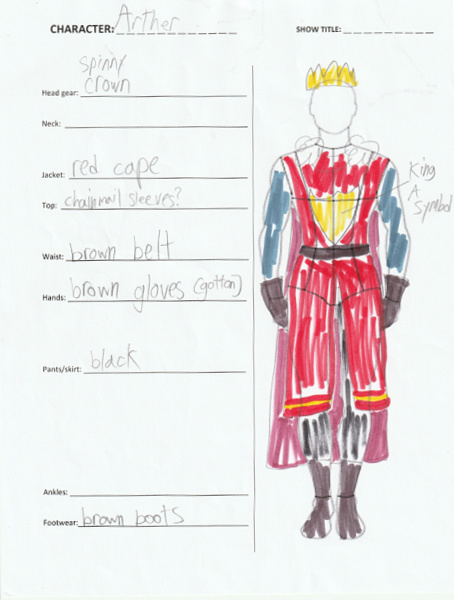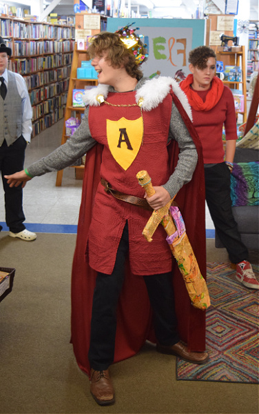 Reegan Hall serves as our Prop Master in addition to her role as Sherlock Holmes. She worked on planning and designing the props and set dressing needed for the production. The kids made everything from a Holy Grail to a book-themed vase to the legendary Excalibur crafted from “medieval manuscripts.” Our idea was that, as book characters, their belongings would be paper too. So our student artists forged Excalibur and a scabbard for King Arthur out of cardboard and papier-mache. We allowed them to decorate and design as they saw fit.