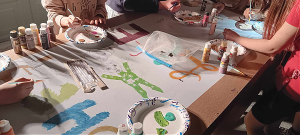 Of course, the biggest project–especially physically–was the giant magic book. We dreamed about our literary figures emerging literally emerging out of a big book to start their after hours adventures. The actual design and build of the big book comes from Set Designer Michael Stallings, but the painting of the characters on the front cover came down to the kids. Not just the actors, but the kids working on the crew are also represented. And the director and assistant director got a little nod as well. Scenic Paint Poss Devanne Fredette also offered a drawing class for interested students.