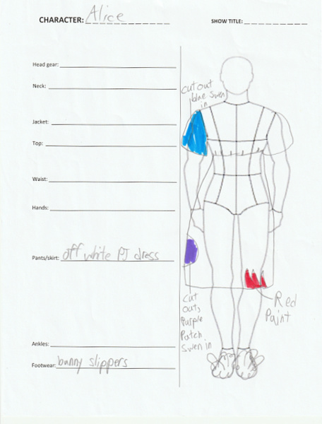 With the director, Daniel Stallings, providing a general brief to his student designers of “What would fictional characters look like on their day off? Costume meets loungewear,” they went to work. Kaylee Erb, who plays INH in the show, designed the costumes, taking inspiration from traditional depictions of the characters melded with ideas like pajamas and slippers for younger characters. Little references abound such as red paint smears on Alice’s dress from painting roses. Skilled costumer and seamstress Margit Stallings lent her skills to fabricate many of the specialty pieces such as Alice’s homemade bunny slippers and King Arthur’s tabard and (faux) fur cloak. Devanne Fredette, a talented crochet artist, contributed with hand-crafted belts, reticules, and snoods.