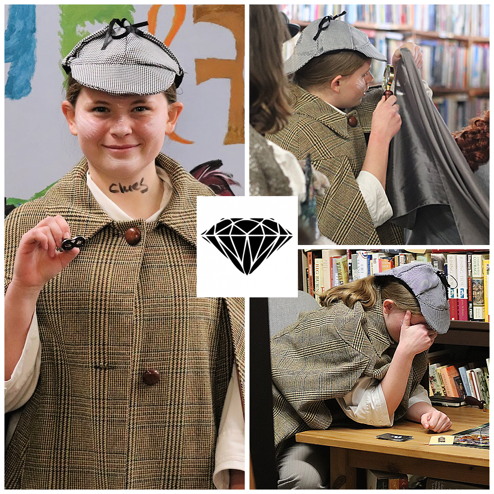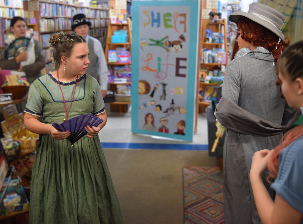 As the characters part to start their evenings off and discuss who INH might be, the audience was broken into four groups to rotate around Red Rock Books. Guided by our wonderful crew (Gavin Pate, Brax Curran, Devanne Fredette, and Daniel Stallings), each group would stop at one of four stations around the store and watch the characters play, gossip, and remember information they may have gleaned about our forgotten character. Was she a dimplomat from faraway lands? What could one of her siblings have to do with pumperknickel? How many names could start with the letter M anyway? Along the way, laughs were abundant as the characters even got to improv some extra chaos. Did you hear about Nancy Drew and Sherlock? Can you really win Clue by building an army in the royal bathroom? You never know what clues you’ll pick up on your trip around the store.