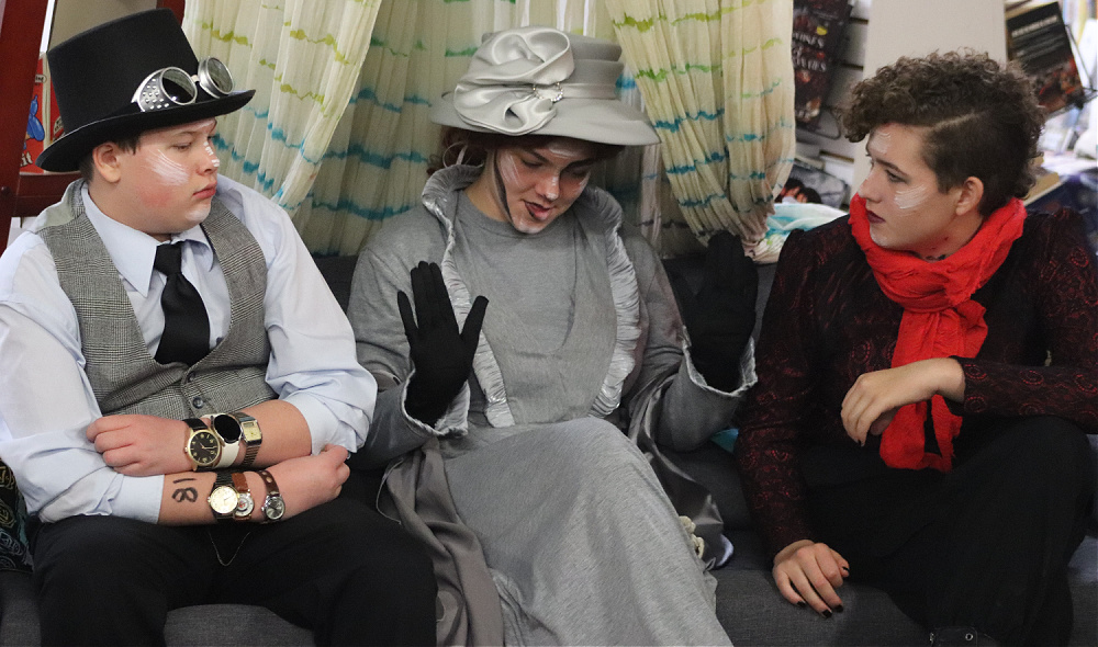 This year, we received a special commission: a mom wanted to know if Master Mystery Productions ever created a show to be used as an art credit for homeschool students. Would we be willing to design a production the students could work on? And the answer was: YES. We have never shied away from teaching the art of theatre to newcomers and adding more voices to the theatrical universe. Shelf Life was specially written and created with the students in mind, giving them a show that didn’t baby them but allowed them opportunities to put their creative spin on the script. We didn’t want the show to be overrun by veteran performers with tons more experience. We kept auditions closed to the kids only and pulled our design team directly from the invested students. This way, the kids had the agency they needed to create, dream, design, and build. MMP brought in some of our legacy artists as mentors to the students in areas such as Voice and Accent, Scenic Painting, Makeup, Props and Set Dressing, and Costume. They simple coached and guided the students with additional professional insight into making designs practical for theatre. The students did all the designing themselves. We want to thank Calvin Johnson, Devanne Fredette, Olivia Holm, Janis Kunz, and Beth Sparks-Jacques for sharing their expertise with these kids.