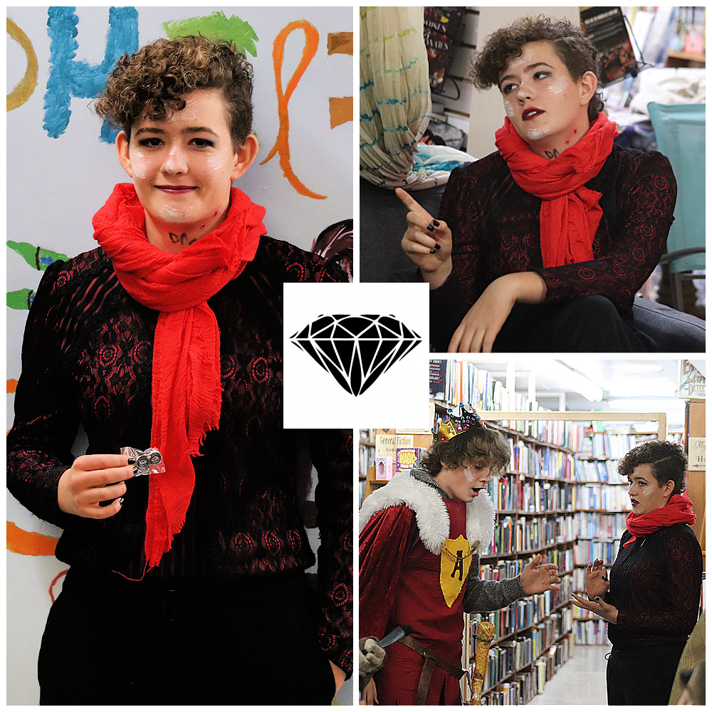 Margit hand-crafted–with the aid of Michael–elaborate heapieces and fairy crowns for CLOTA’s production of A Midsummer Night’s Dream. Michael was an eleventh hour superhero who came to fix a broken set piece for Midsummer mere minutes before the doors opened for a performance. For Shelf Life, they went above and beyond. Margit sewed and executed young designer Kaylee Erb’s costuming vision and making everything from King Arthur’s cape and tabard, Alice’s bunny slippers, altering and decorating any number of dresses, and more. Michael built the giant book for the characters and moved it into the bookstore for us. When troubles emerged with transportation, they volunteered their time to move chairs to the venue. Always on hand to help, we came to rely on their patience, their experience, and their ability to solve problems as a rock during any crazy moment in theatre.
