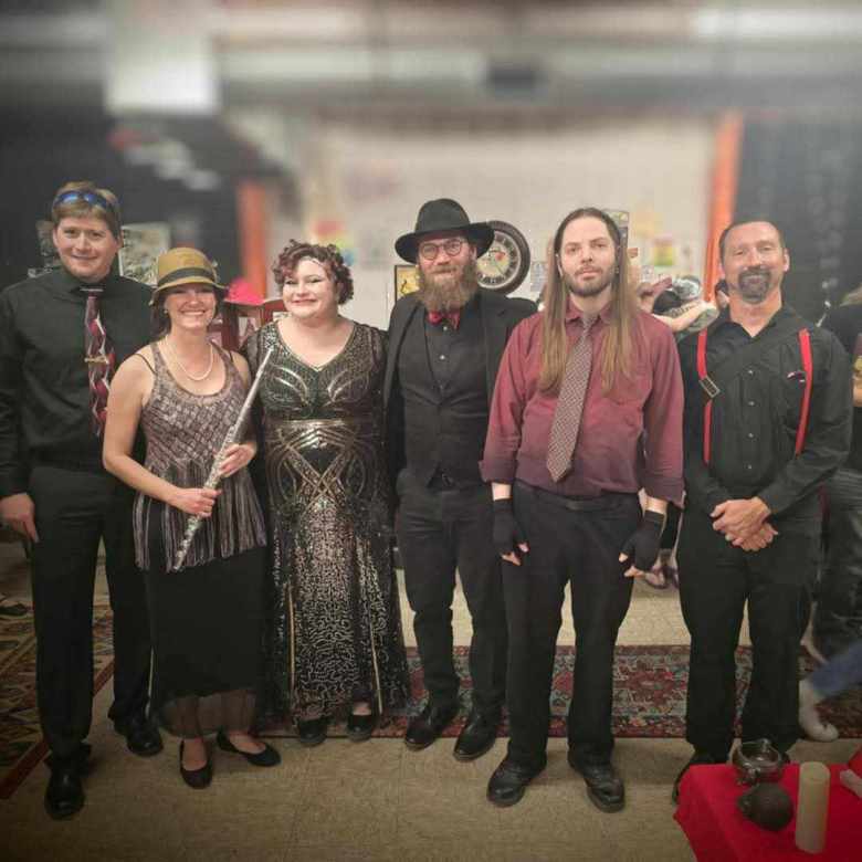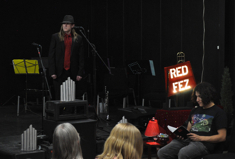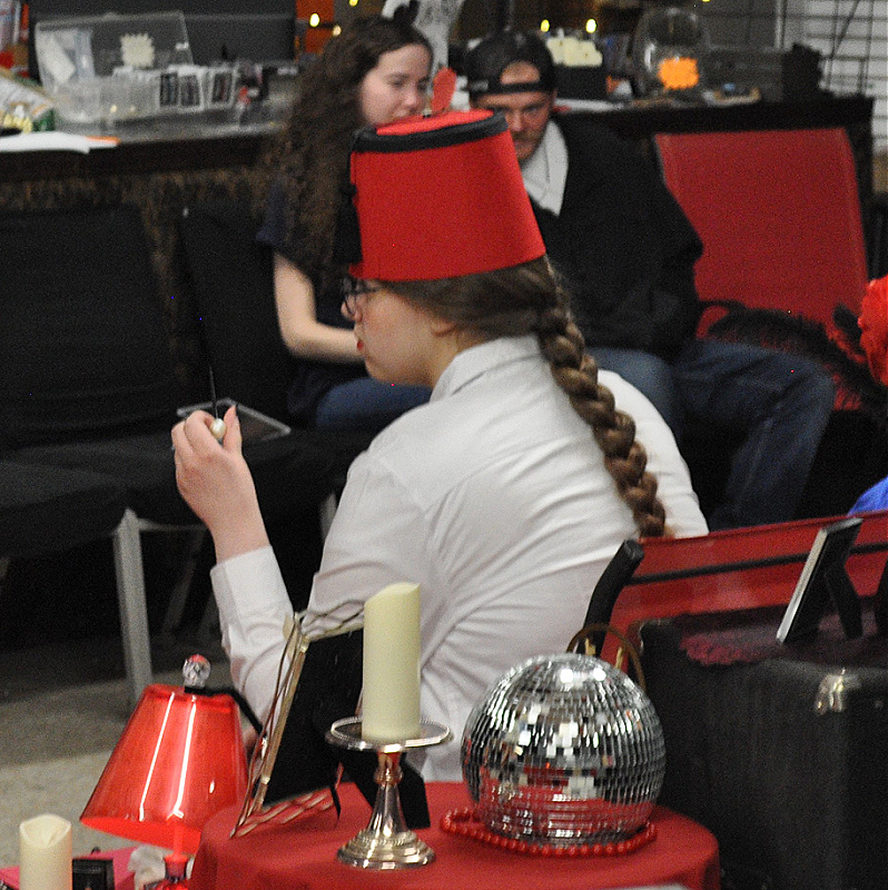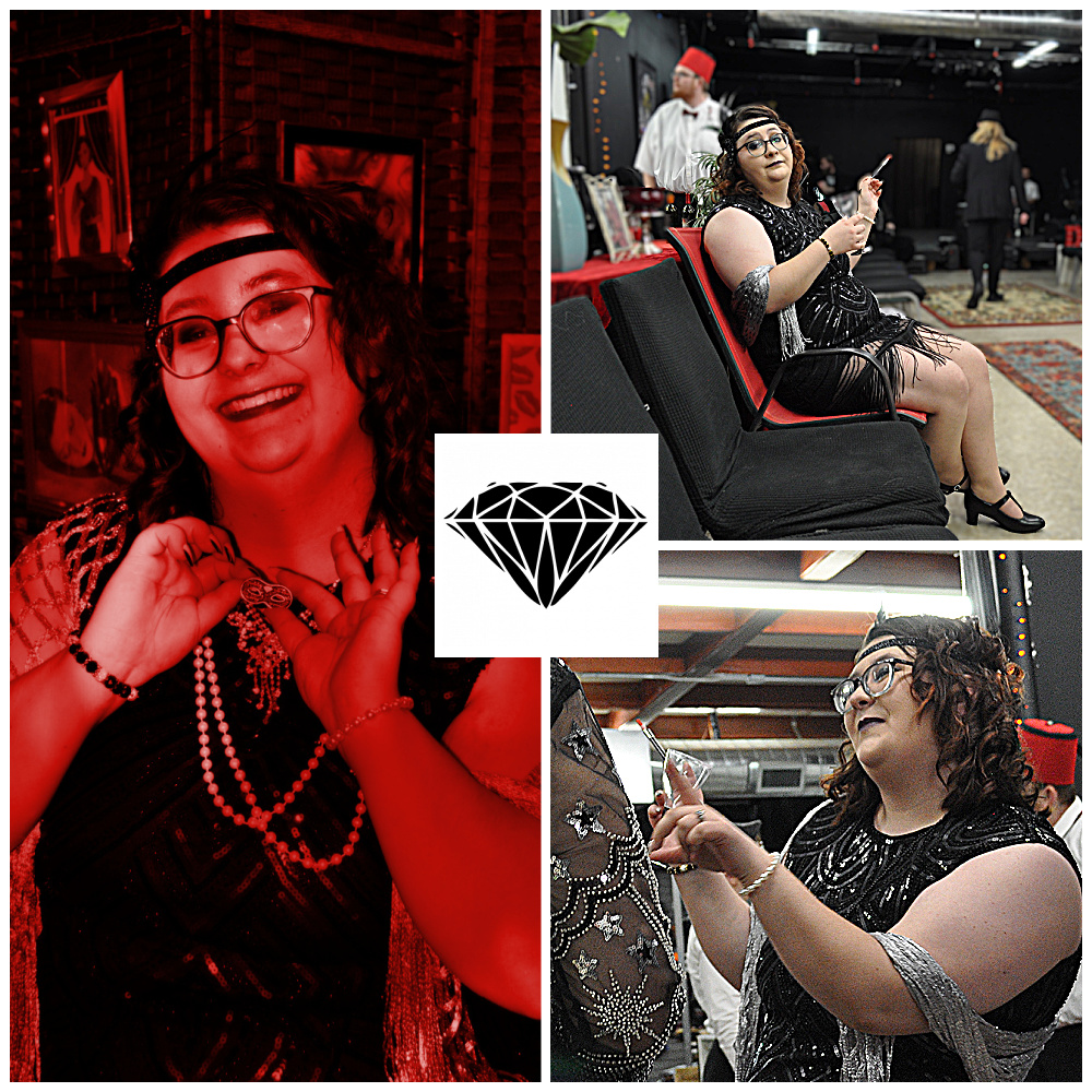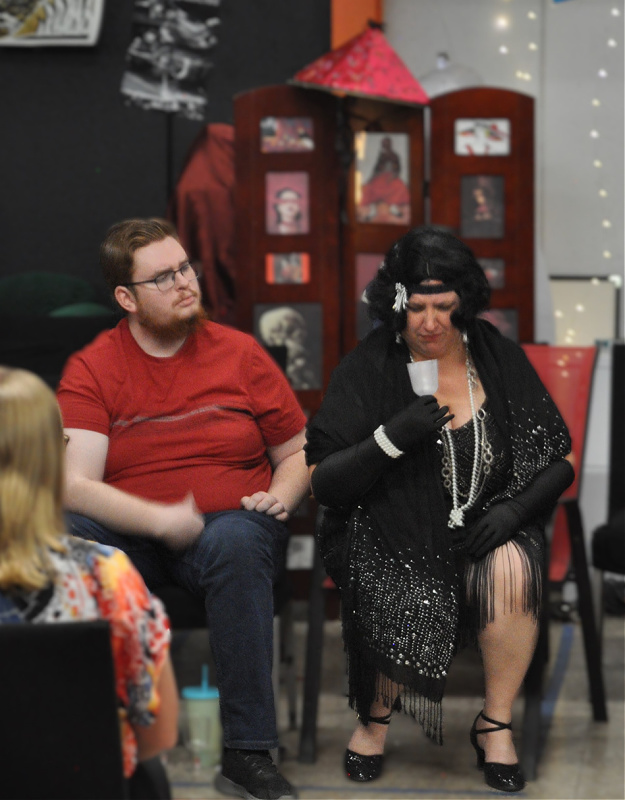 We returned to Moe’s Music, now under new ownership, for the first time since Spring 2023’s The Sky’s the Limit. And we transformed it into a speakeasy for two weekends only. Guests checked in at the front door where they received their instructions. The secret password for the Red Fez was “oyster fruit”–gangster slang for pearls–which they gave to the bouncer. They would receive a complimentary Red Fizz–a mocktail made from cranapple juice and lemon-lime soda–from the bartender. And then plunge into the shadowy speakeasy where Blue Creosote, a local jazz band, would start playing music. One of two casts–Cast A and B–would perform that night. Soon, an evening of glamorous flappers, dangerous gangsters, murder, mayhem, and martinis would fill the Red Fez.
