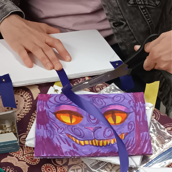 Daniel pictured the bookstore covered in mysterious doors in bright colors. Some would open and you could peer into Wonderland when you looked inside. What a great way to make you, the audience, feel like Alice herself. It was also a great project for the budding artists in our Youth cast. Daniel had both casts and crews draw pictures for the Wonderland views and the doors themselves. Using some foam posterboard, index cards, crayons, markers, colored pencils, washi tape, brads, tape, glue, ribbon, elastic string, wooden beads, and elbow grease, these mini doors came to life adorably. They are scattered throughout the store right now, with paper keys enticing you to “Open Me.” Please do! When you open the door, a magical scene, drawn by a cast member, waits for you.