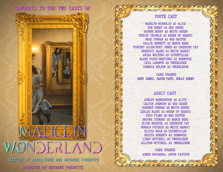 Devanne: Malice In Wonderland began as a request from Ann Rizzardini, Red Rock Book’s very own owner, to write a play based on Alice in Wonderland. Red Rocks Books has been the home of many MMP shows so when I was asked to write a show for them, I was incredibly honored, and with a fairy tale, no less, that is as respected and loved as Alice in Wonderland, I also knew I had my work cut out for me. So, I started at the source. Personally, I started listening to the audiobook to be able to visualize what I could carve out for Malice. It was quite fun, and I would find out soon quite in theme. Malice in 2019 was quite fun writing; It was decided early on to be a more family-friendly show with the idea that it would have a sort of mini-carnival in the bookstore like painting-the-roses-red and just experimenting with different whodunits and whydunnits and all the other hullabaloos.