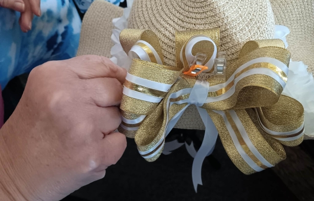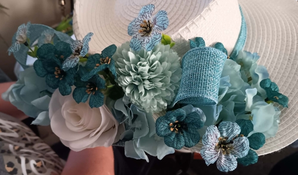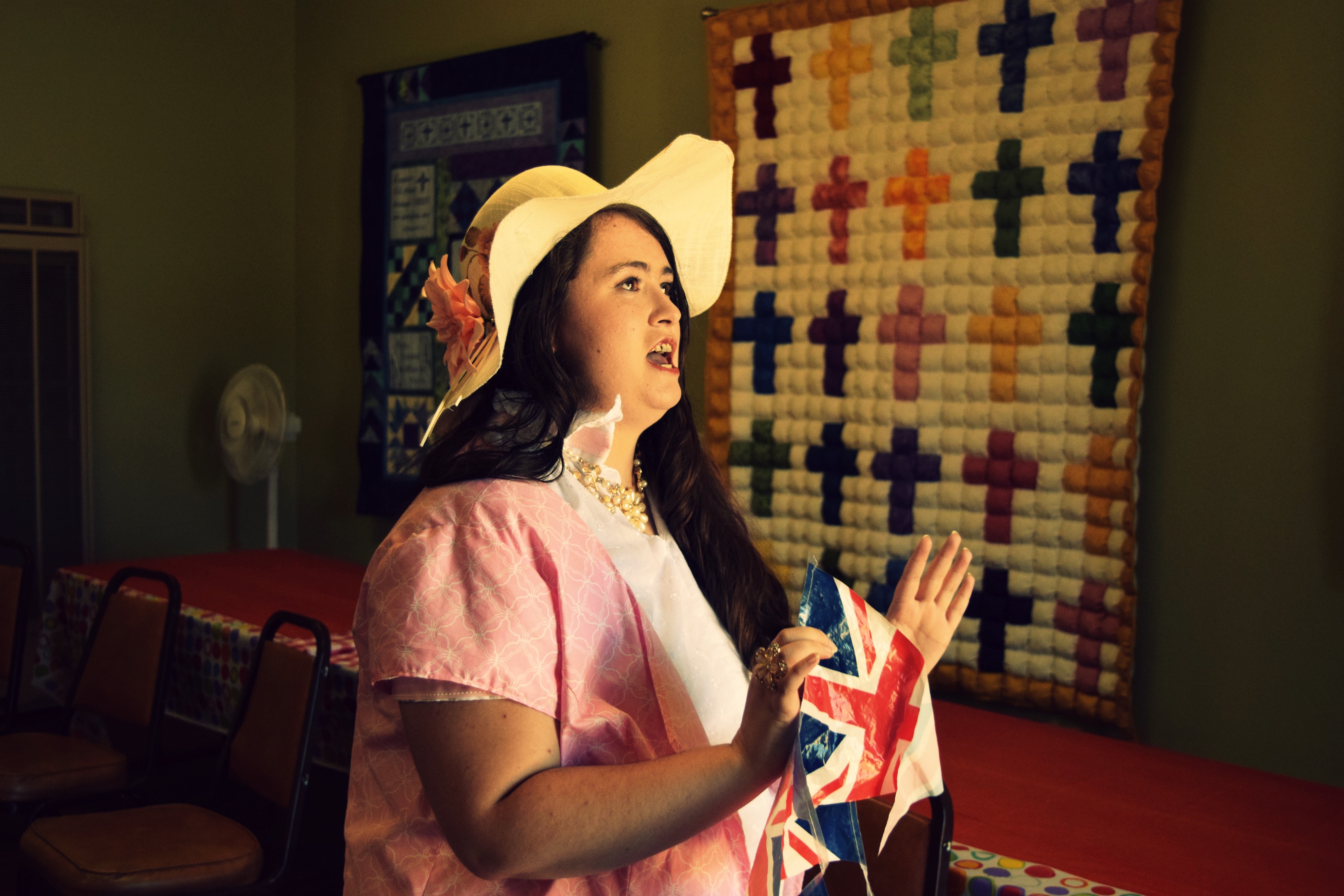 2026’s Phoebe gets a brand-new look designed by legendary MMP costumer, Beth Sparks-Jacques. Instead of green, we went with a brisk, fresh teal found in the necklace chosen by Jewelry Curator Allison Mitchell. Phoebe’s youth is exemplified by her more modern dress with a streamlined skirt and crisp blouse with a diamond pattern. As opposed to the earthy oatmeal shades we used in the first production to show how “grounded” Phoebe is, we opted for bright white, symbolizing “peace,” so she seems to be a dove against a bright blue sky. Her custom hat, created by Margit stallings, whose work includes the staggering fairy crowns for 2024’s A Midsummer Night’s Dream at CLOTA, is a profusion of blue and white flowers.