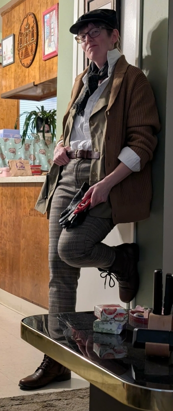 Thomas Hangsby is, perhaps, the lowest of the lower class characters. An undergardener…not even a head gardener. His grubby, rough-and-tumble appearance (which we love) with artistically dirt-smudged fingers and nails (with makeup) forms a perfect contrast with the starched cleanliness of the maid and housekeeper or the glamour and polish of the aristocrats. So naturally, earth tones pervade the costuming, thrifted by Janis Kunz. The shapes and cuts are slouchier; This is not a man with tailored clothing. It’s patched and hand-me-down and curated from disparate places. Layers of vests and jackets, a loose white button-up for brightness, a fringed earthy gray scarf with orange accents, plaid trousers, and worn brown boots create an ensemble that ties with the whole costume scheme and touches shared colors and patterns with characters like Paul and General Major, but also still retains its own personality. But for a pop of color: blood-red secateurs. A delightfully sinister note ideal for a murder mystery.