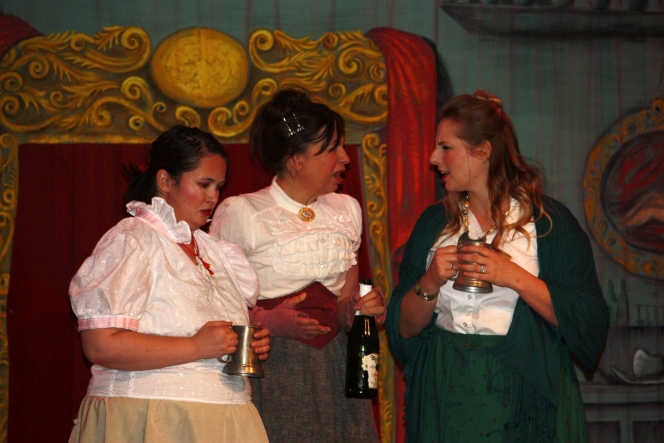 The previous costume scheme was inspired by the “country” outfits worn by the cast of the 1990 Metropolitan Opera’s production of A Little Night Music: all creamy white to suggest a sort of “angelic” demeanor. Of course, we meant that to be an ironic beatitude. This evolved over the production to a range of tea colors and cream, white, oatmeal, etc. The cream of the crop, if you will. Then each character got a pop of color to brighten them up (the show is a comedy after all): spring green, peacock blue, sassy pink, rust brown, and rich wine purple.