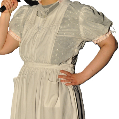 We discussed Eloise “inheriting” Phoebe’s 2016 blouse earlier. Eloise is a young parlourmaid with big dreams and big imagination. She can have more delicate, flouncy, and brighter things to wear, especially if Phoebe, her American mistress who sees Eloise as a friend more than as a maid, gives them to her. A touch of soft pink brighens up a more sober outfit with a gray skirt and a full, starched apron last worn by Mrs. White in Clue the Musical at CLOTA during Summer 2023. The mobcap Eloise wears is reimagined from one made for Marianne in Eat Cake, its red ribbon swapped for pink. Fun fact: The cap is made from leftover embroidered cotton from the 2016 blouse. And it’s never been worn with its matching blouse until this show. No time like the present, huh?