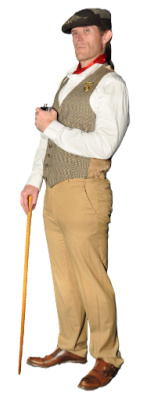 General Major maintains a similar idea between the shows: shirtsleeves, waistcoat, bold cravat, medals, trousers, newsboy, polished shoes, flask. Although he represents a military man, he’s also the drunk, informal uncle at the party with not much of a filter and not much awareness of his surroundings. He’s not an aristocrat in the same way as the others, being a military officer and not an inheritor of generational land ownership. Keeping him in shirtsleeves distinguishes him visually from Paul, a son of the gentry, in his formal suit. The colors were chosen to evoke sand-swept locales of Northern Africa, emblematic of British colonialism and military campaigns. Plaids and herringbones are his patterns, clashing in ways that suggest warfare or perhaps the disordered state of General Major’s mind. While the cut of his clothes is very regimented, there are little suggestions to his life of violence: the clashing patterns unified through colors, the hand-carved bristly spikes on his walking stick, and his red cravat. Red–the General’s chosen color–symbolized violence and warefare. On his chest, he displays a medal. For what? Bravery? Or something more sinister?