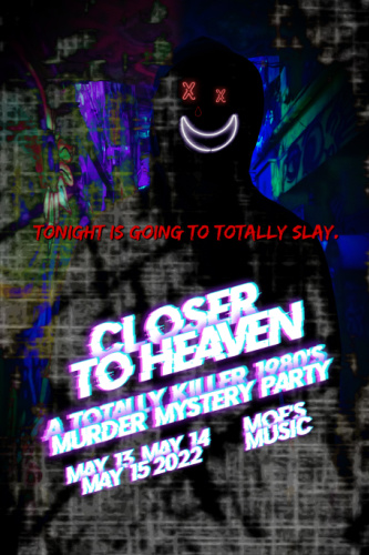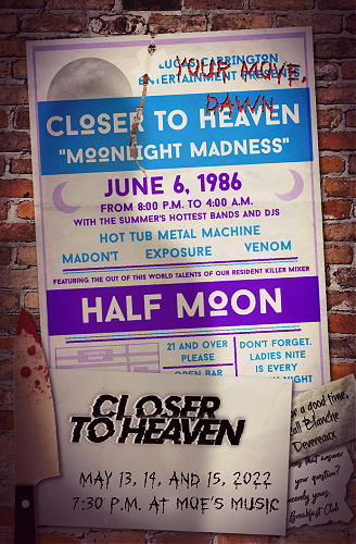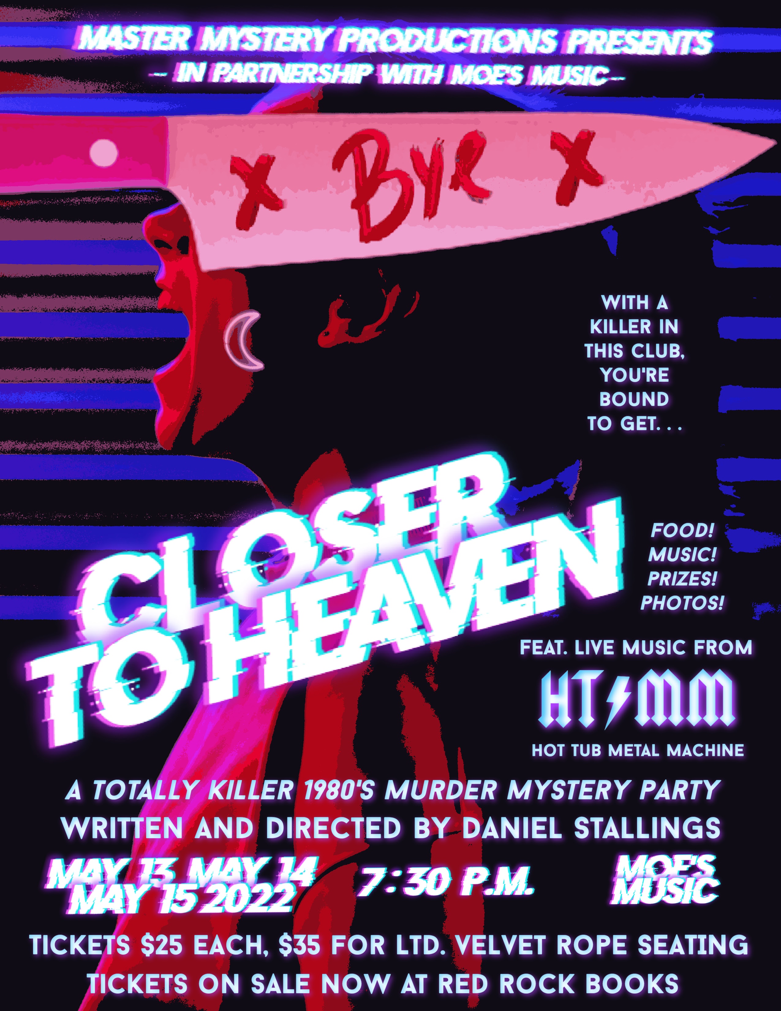 CLOSER TO HEAVEN (May 2022), our 29th Master Mystery Production, is a totally killer 1980’s murder mystery party set in a neon nightclub in the heart of Los Angeles where the employees spend one terrifying night wrestling with a serial killer known as the Half Moon Killer. With the club’s owner being the famous survivor of the killer who is determined to trap him for good, the stage is set for live rock music, dark secrets, and an intense confrontation with a moonlight madness monster.