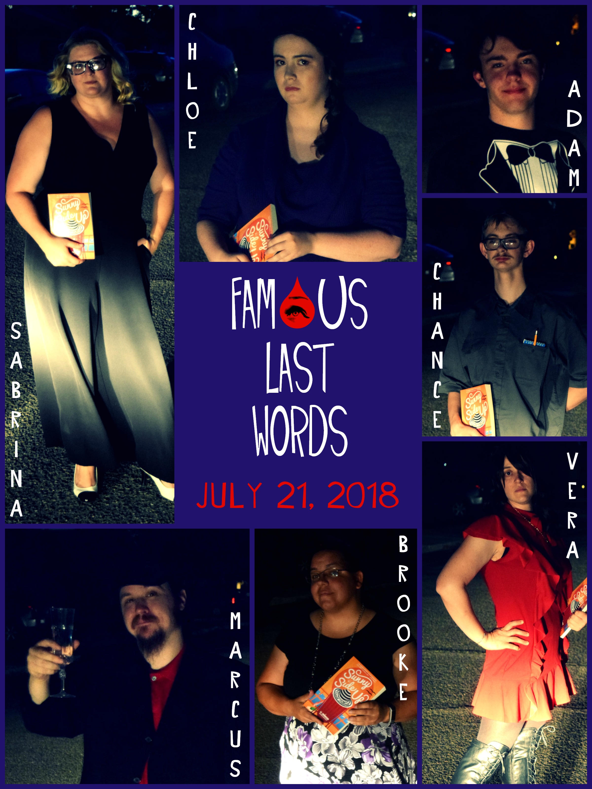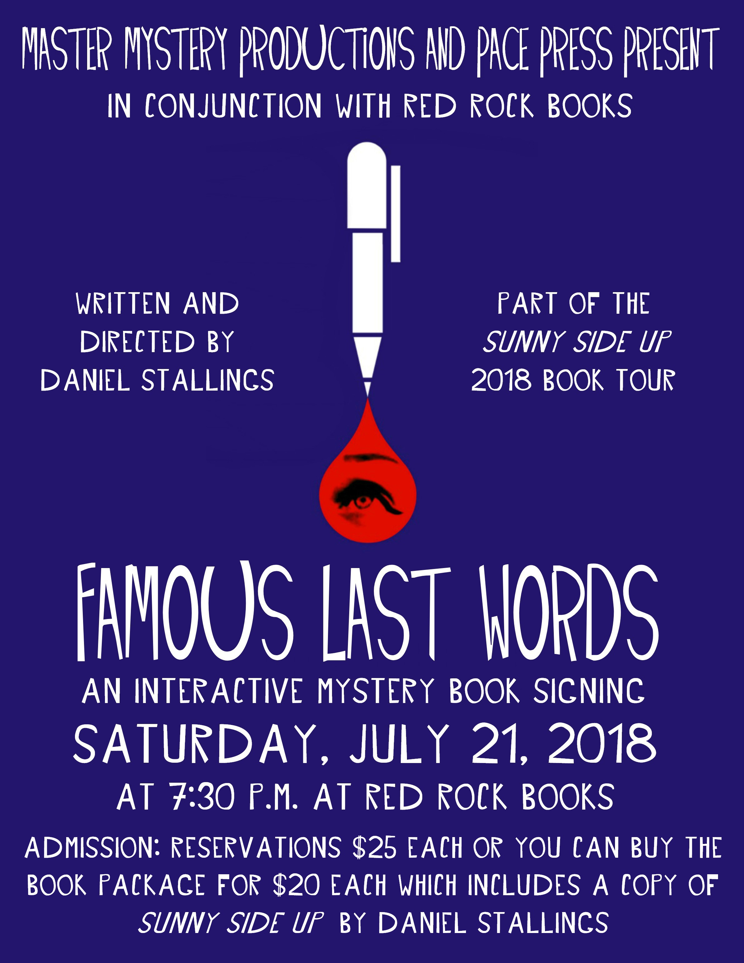 The nineteenth Master Mystery Production, FAMOUS LAST WORDS (July 2018) is an interactive mystery book signing first designed to commemorate the publication of writer/director Daniel Stallings’ debut mystery novel, Sunny Side Up. Guests roamed the bookstore as sleuths tying to piece together the truth of mysterious cold cases by listening to the testimonies of several witnesses and interested parties…who may turn out to be suspects as well.