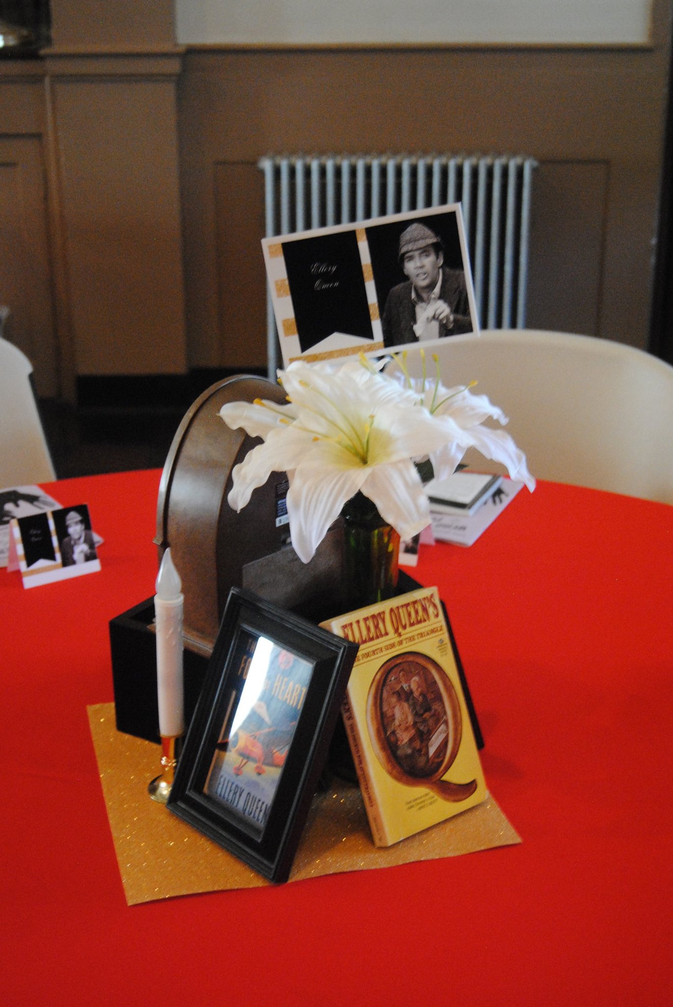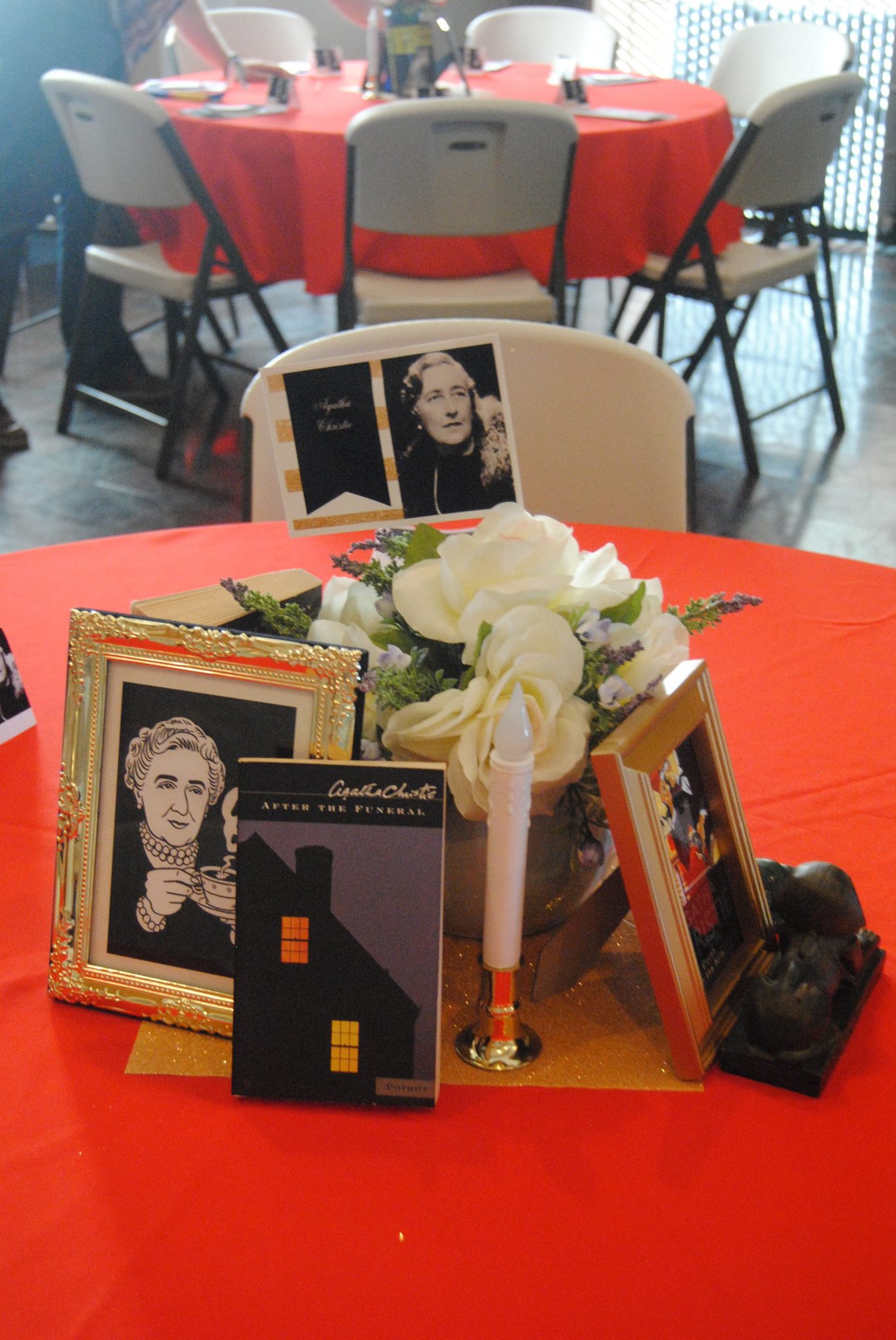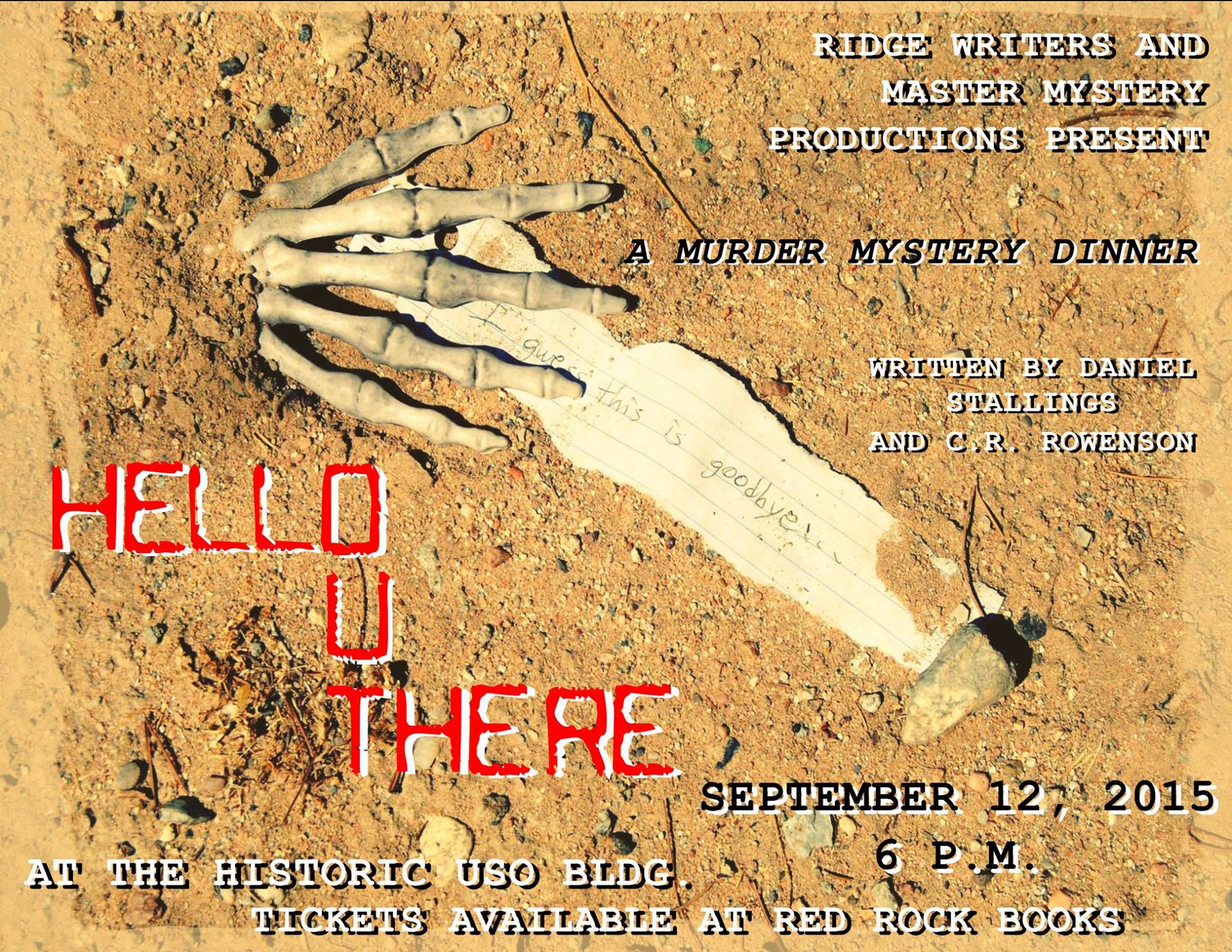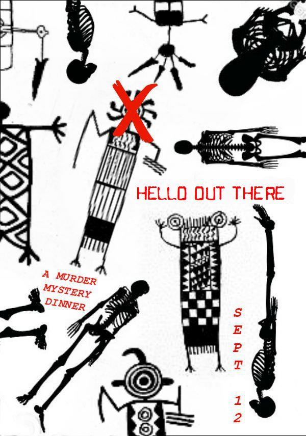 Hello Out There (September 2015) is an interactive murder mystery dinner set in the Mojave Desert. Tables formed teams of sleuths, each named after famous mystery authors and fictional detectives, to solve the crime.