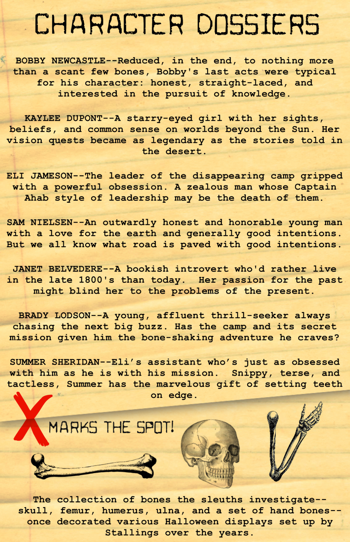 Fierce winds and the attentions of scavengers have unearthed a deadly secret in the Mojave Desert. Human bones, lost for years, and the tattered remains of a backpack tell a story as mysterious and dark as the legends swarming this secluded slice of the world. Teams of sleuths have assembled to finish the story. Because the bones bear the marks of murder and the scant belongings tie the skeleton to a vanishing camp several decades before. What secrets bind the two together? What do the legends of yesteryear have to do with the bodies of today? What of the missing campers and the references to lights in the sky? This will be a unique murder mystery to suit this weird and wonderful locale. Will the sleuths be able to navigate the twists and turns of this bizarre case? Or will the searing sands of time bury the truth of this cold case forever?