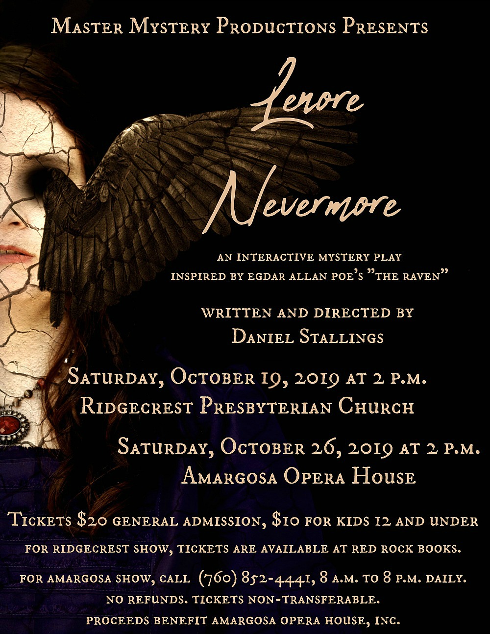 LENORE NEVERMORE (October 2019) is our landmark 25th Master Mystery Production, a Gothic psychological thriller set in the universe of Edgar Allan Poe’s “The Raven.” Confronting the painful and powerful memories of a young woman’s murder, a hurt and haunted scholar must acknowledge the darkness and demons inside him in the form of living statues, talking ravens, and ominous memories to learn whodunit, how, and why.