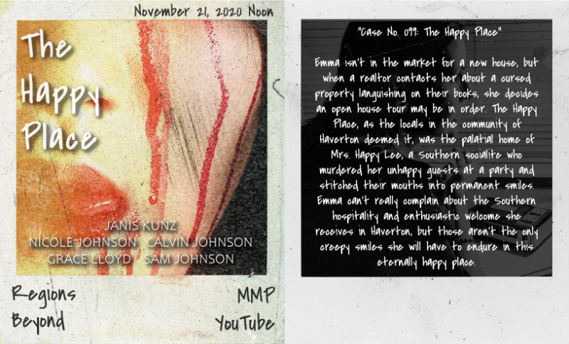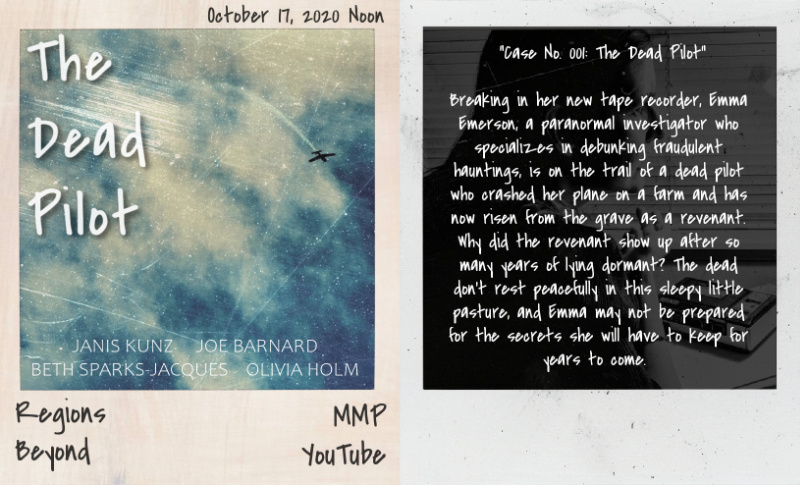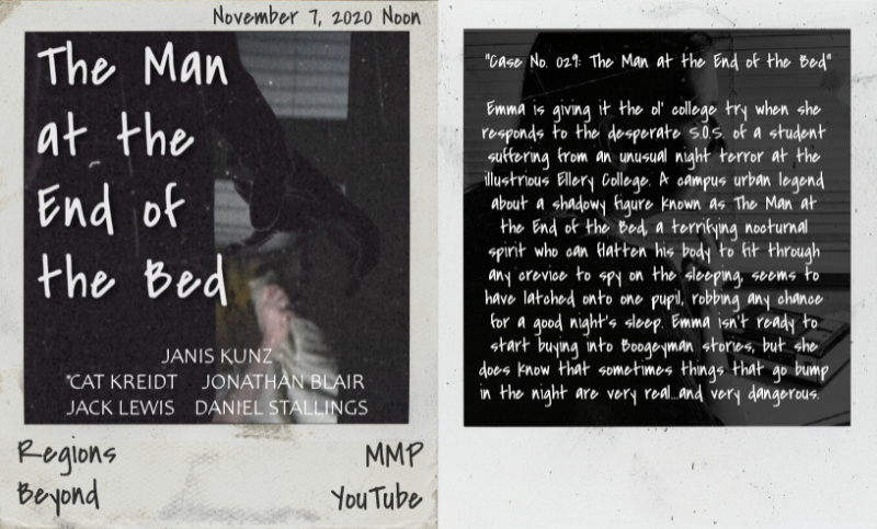 REGIONS BEYOND (October 2020), our 26th Master Mystery Production, is our first digital series, a found footage paranormal mystery series inspired by The Blair Witch Project and Scooby Doo. Framed by a disturbing and unsolved disappearance decades ago, the series is formed from a paranormal investigator’s long-missing cassette tapes of her investigations. Recorded on these tapes are not only the individual mysteries she solves about ghosts, witches, monsters, and more, but also the trail of clues to what really happened to Emma Emerson and her cat, Samhain, many years ago…