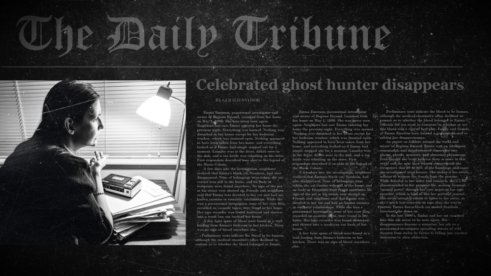 While searching an old storage building, you stumble across a box holding a voice from regions beyond. Secreted away in a dusty and forgotten corner is a long-lost collection of cassettes that could hold the keys to a celebrated and unsolved missing persons case. Before her unexplained disappearance decades ago, Emma Emerson was an experienced P.I. But in this case, P stands for Paranormal. She ran Regions Beyond, her investigation service into all things ghostly and ghoulish. An expert in folklore and debunker of hoaxes, Emma traveled all over the country to sniff out the spirits wreaking havoc in old hotels, abandoned houses, creepy cellars, and haunted theaters. With her trusty tape recorder, Emma recorded her case notes, interviews with witnesses, and the unearthly phenomena and voices from beyond. But not all things that go bump in the night come from the afterlife. Trapped on those tapes are the clues to sinister mysteries where fiendish minds have turned to many a monster and manifestation to disguise more human motives. And with her notes to help her, Emma will unmask the people orchestrating these otherworldly nightmares. And by listening to her last words, will you be able to follow the trail to what really happened to Emma all those years ago?