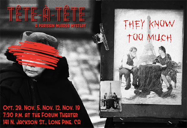 Mechanics: Ensemble production with flexible casting. Script originally written for five roles with actors doubling roles. Original production in Lone Pine became a Showstopper with a dynamic chorus of bohemian artists who shared roles as suspects. Works well with a high-concept artistic plan.