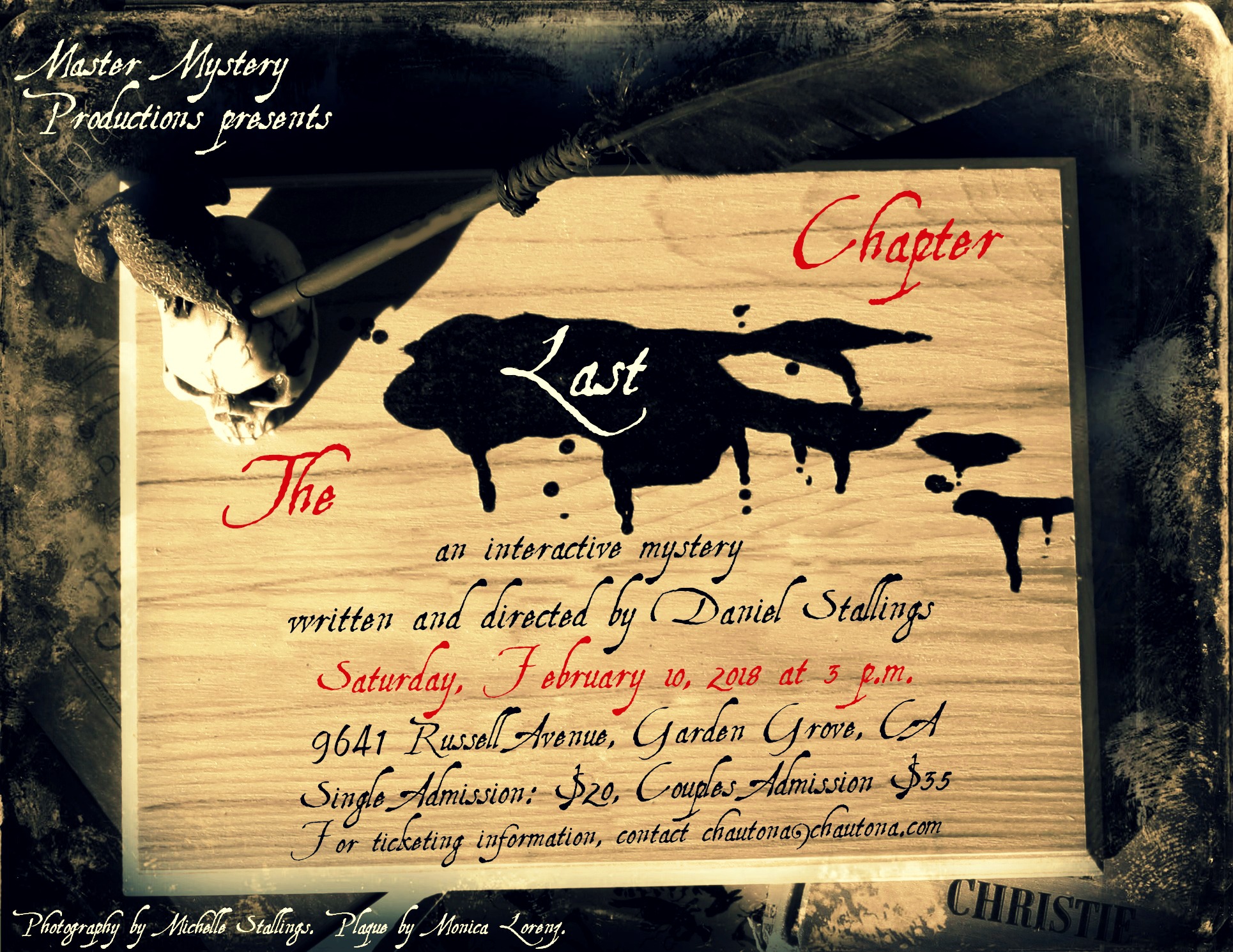 THE LAST CHAPTER (February 2018), the seventeenth Master Mystery Production, celebrates the world of literature as the ghosts of famous literary legends issue challenges designed to earn clues and unveil the truth behind an act of terrifying rage.