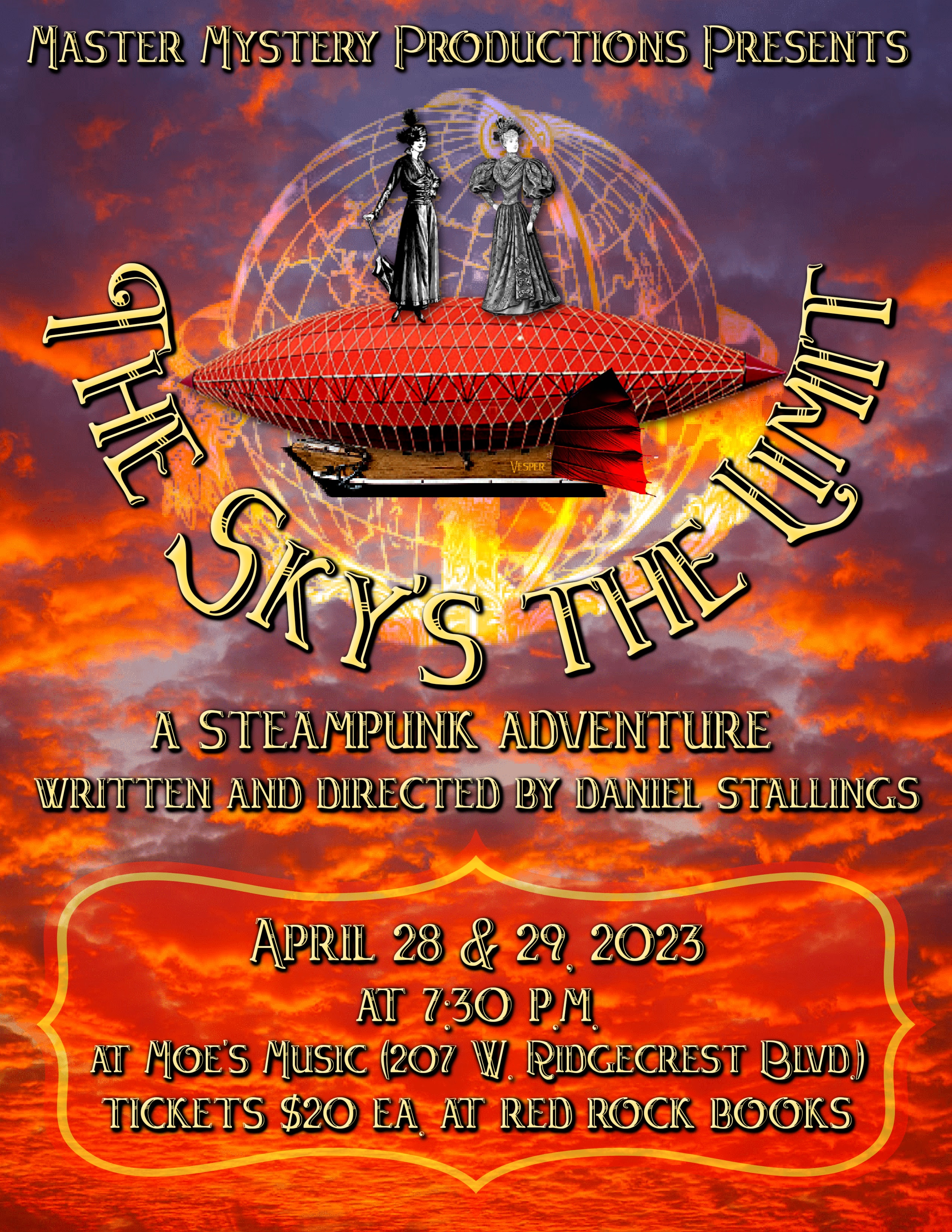 THE SKY’S THE LIMIT (April 2023), the 33rd Master Mystery Production, is a sky-hopping steampunk adventure aboard an airship carrying two American reporters across the Atlantic Ocean, only for the ladies to discover they have been kidnapped by their eccentric pilot and his many marvelous, maniacal machines…