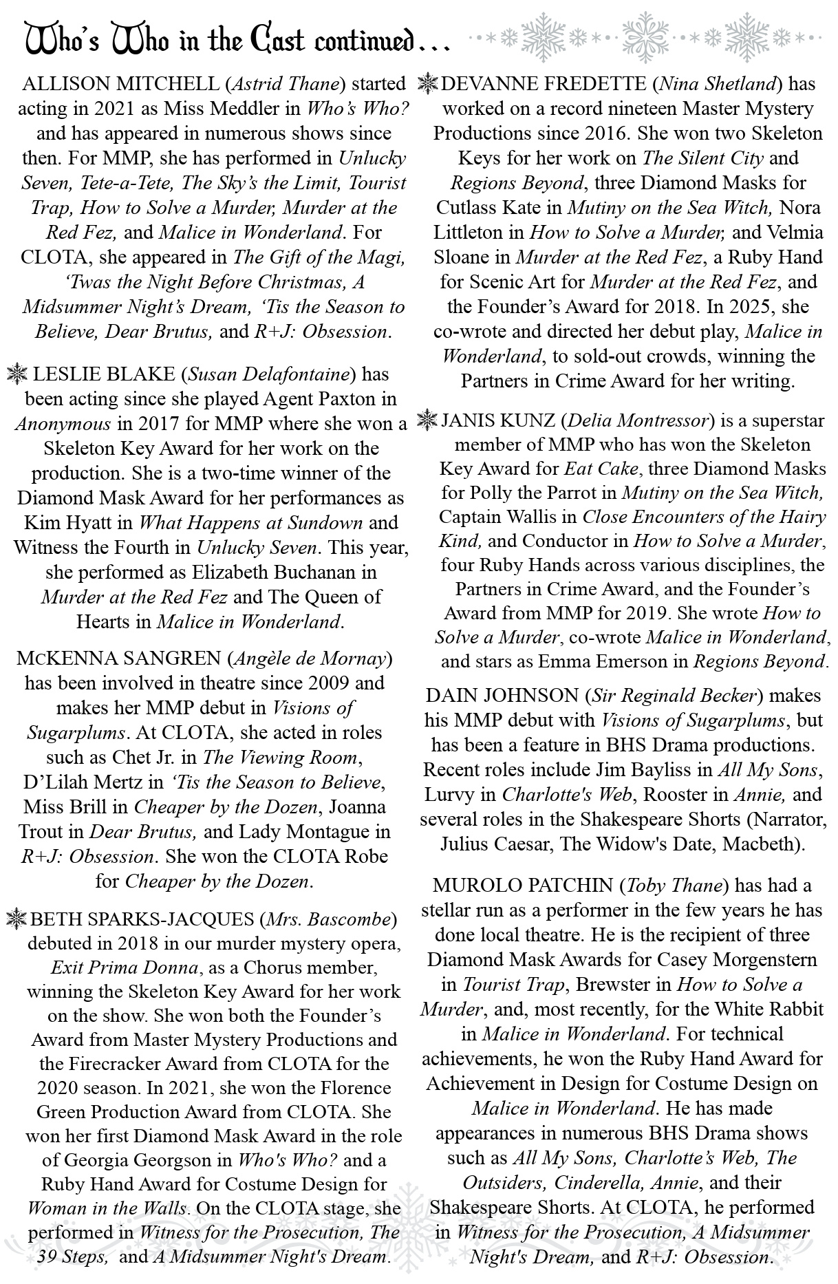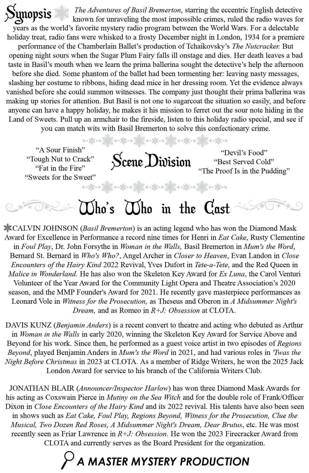MMP’s 39th show whisks us to the snowy streets of London where a prima ballerina’s visions of torment culminate in her unusual and unexpected death onstage while dancing the Sugar Plum Fairy in Tchaikovsky’s The Nutcracker. Leave it to an eccentric genius detective to crack this tough nut of a case…